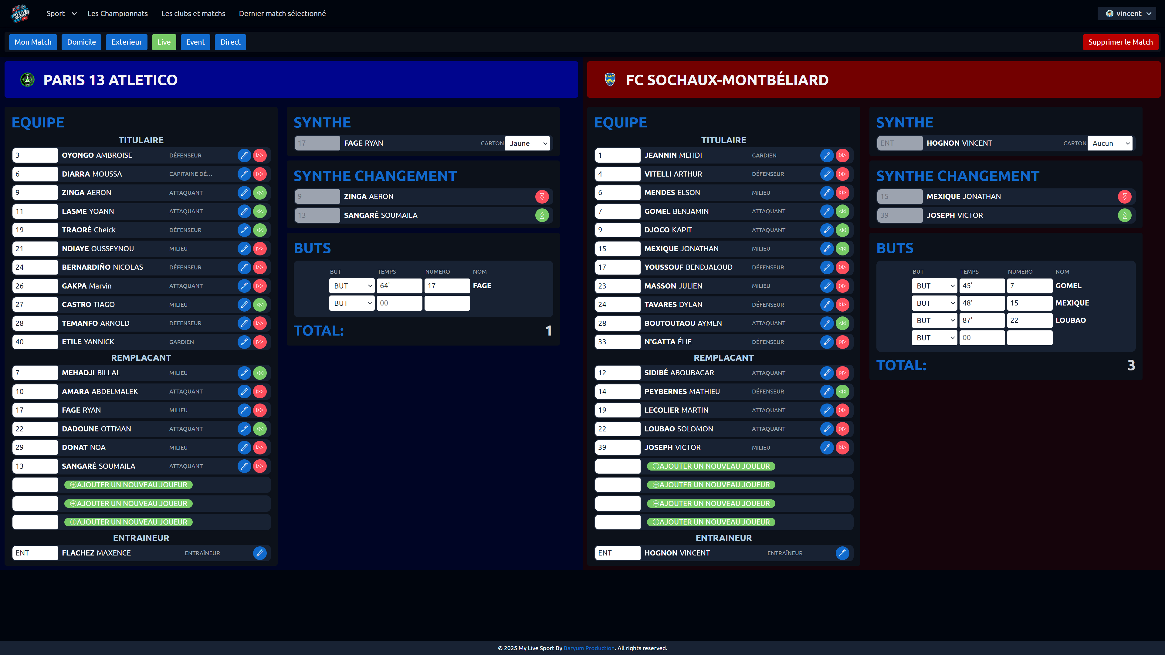 Utilisez les panneaux pour ajouter les événements (but, changement) en direct.